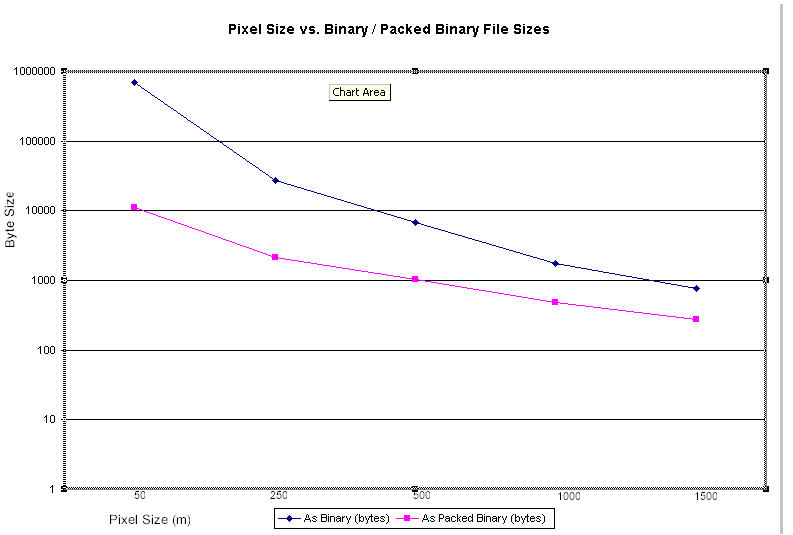 In part B, the impact is seen directly in the byte size of the files. File sizes are logically larger as pixel sizes decrease, because of the higher definition needed for smaller pixels. The packing ratio is also better as pixel size decreases; I believe this is attributed to more of the same values as the pixel size decreases (50, 100m) as opposed to less of the same values in the larger pixel sizes (1000, 1500m). Therefore, the actual type of analysis of the data must be determined from the start of the project / task. For example, if one is using data to analyze characteristics of highly accurate ground control points (>3 metres), the pixel sizes should be reflective of this (this equates to larger file sizes). However, if one is using global data to assess general characteristics of a world map, pixel sizes may be higher, which results in smaller sized files.